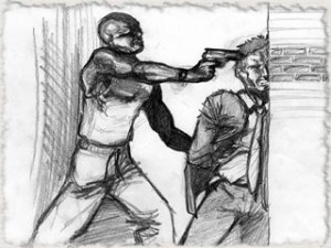 Repentinamente vieron acercarse al grupo a dos individuos, evidentemente sospechosos, y uno de éstos tomó un niño como rehén, y, cuchillo en mano, exigió a las damas que echaran todo el dinero y todas sus pertenencias de valor que tuvieran (anillos, cadenas, relojes, accesorios, etc.) en una funda que llevaron para tal fin.