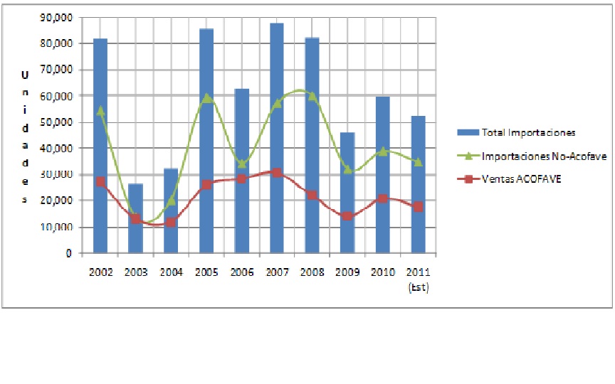 El presidente ejecutivo de ACOFAVE, Enrique Fernández, dijo que en el primer semestre del año se han vendido ocho mil quinientas seis unidades (8,506), en comparación, con las nueve mil cuatrocientos ochenta y cinco (9,485) que se vendieron en el 2010.