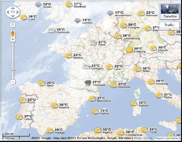 Parece una obviedad: cuando planea desplazarse por el terrotorio o viajar a cualquier lugar del planeta quiere saber qué tiempo hará. Google acaba de añadir una nueva capa a su servicio de mapas, Google Maps, que muestra mediante iconos la metereología del lugar al que se dirige y tambien del resto del mundo, información suministrada por el sitio Weather.com