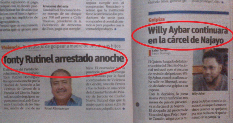 Miren como un pelotero y un ex senador tienen sus espacios reservados en la prensa, ambos acusados de haber maltratados a sus esposas, algo que al parecer se ha convertido en una moda, la imagen corresponde a la edición impresa de ayer, El Día.