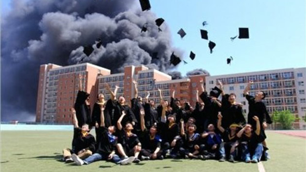 Los graduados de la Universidad de Tecnología de Dalian, situada en la provincia china de Liaoning, participaron en una sesión de fotos con la residencia estudiantil en llamas como fondo, hecho que provocó una gran polémica en los medios del país.