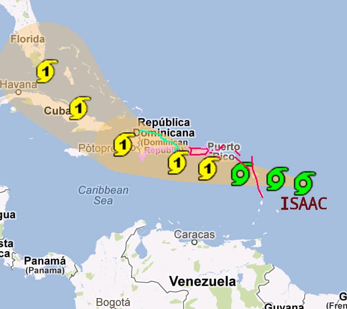 Para mañana jueves en la tarde y noche, de acuerdo a los datos más recientes de pronóstico y análisis de precipitaciones, se prevé que el campo nuboso asociado a la tormenta tropical Isaac se acerque a la isla, provocando un incremento en la actividad de aguaceros tormentas eléctricas y ráfagas de viento hacia las regiones norte, noreste y sureste, extendiendose hacia toda la isla, los días viernes y sábado.