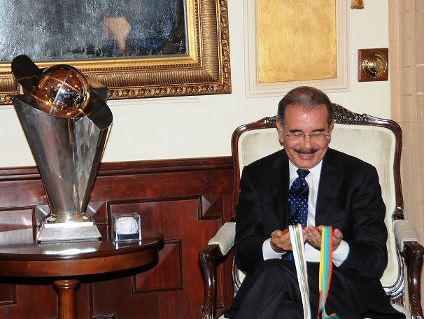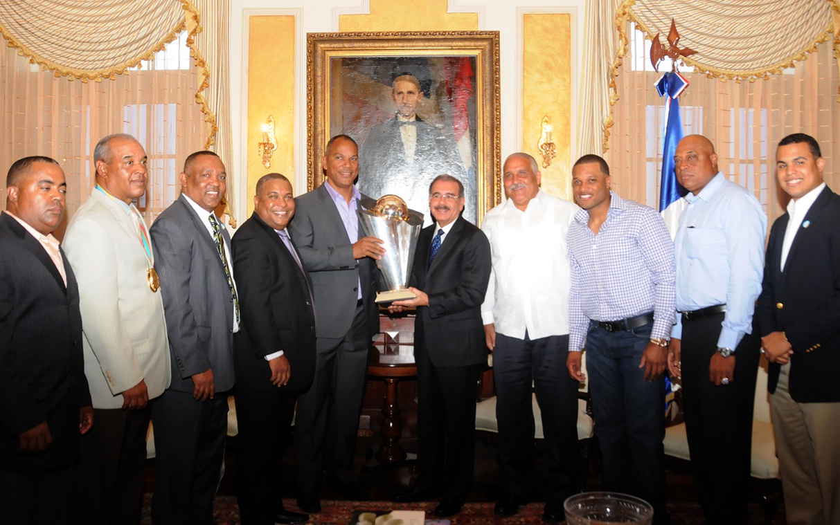 El presidente Danilo Medina recibió ayer en su despacho, a una delegación de los campeones del Clásico Mundial de Béisbol, quienes le mostraron el trofeo ganado por el equipo y las dos medallas que obtuvieron los jugadores
