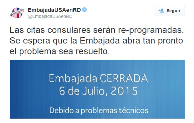 La información fue colocada en la cuenta oficial en Twiiter( EmbajadausaenRD) de la Embajada, donde además señalan que las citas consulares serán re-programadas. Se espera que la Embajada abra tan pronto el problema sea resuelto.