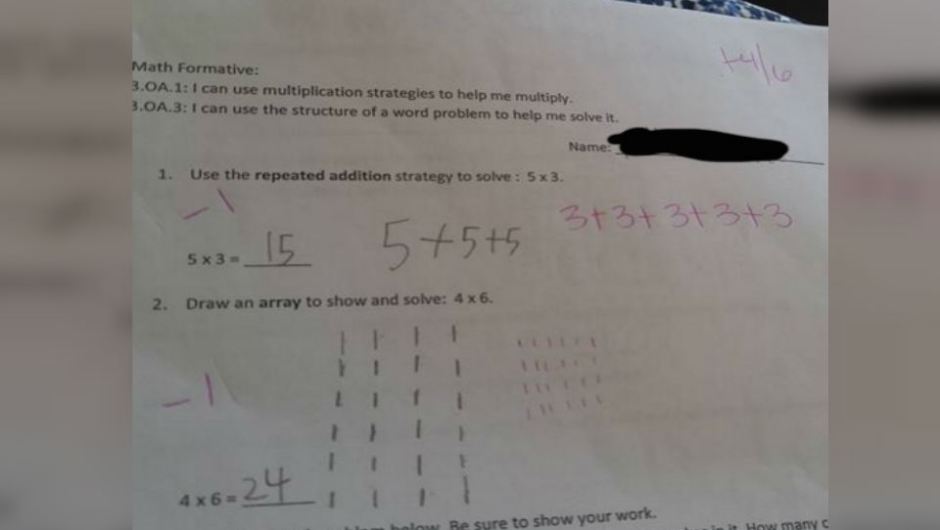 Luego, en el siguiente ejercicio en el que debía elaborar una matriz para mostrar cómo resuelve 4×6, el niño lo expresó en cuatro columnas de seis. Su maestra lo corrigió de nuevo escribiendo que debía haber puesto seis columnas de cuatro.