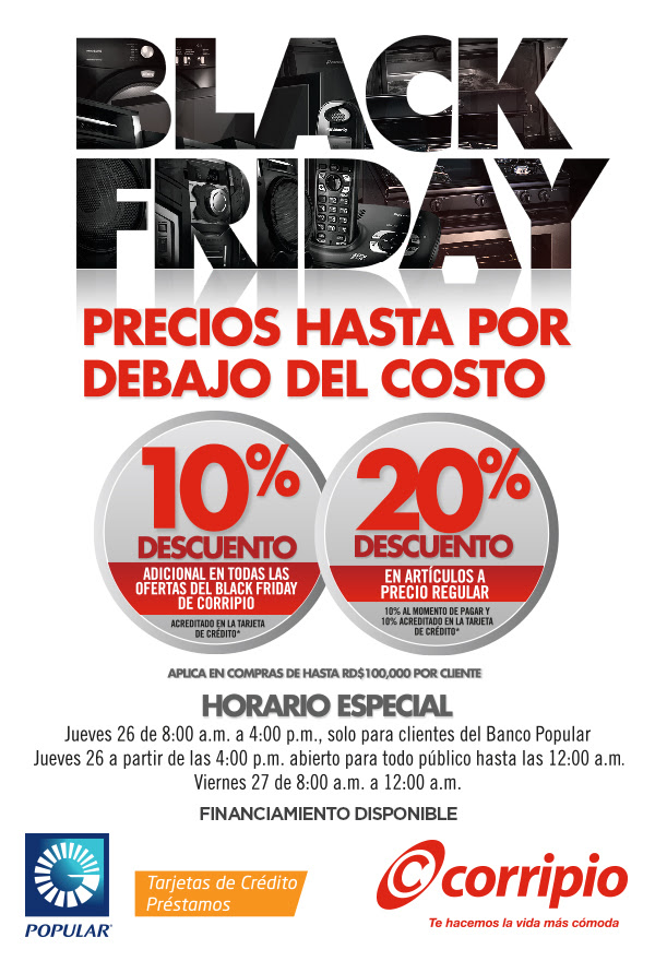 Este 26 y 27 de noviembre, al realizar tus compras con Tarjetas de Crédito Popular, recibes un 20% de descuento en artículos a precio regular y un 10% de descuento adicional en todas las ofertas del Black Friday de Corripio.