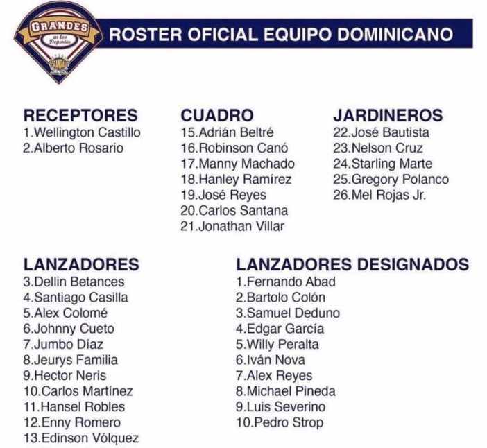 Santo Domingo. El programa Grandes en los Deportes reveló el roster oficial de República Dominicana para el Clásico Mundial de Béisbol que estará iniciando el 6 de marzo en Estados Unidos.