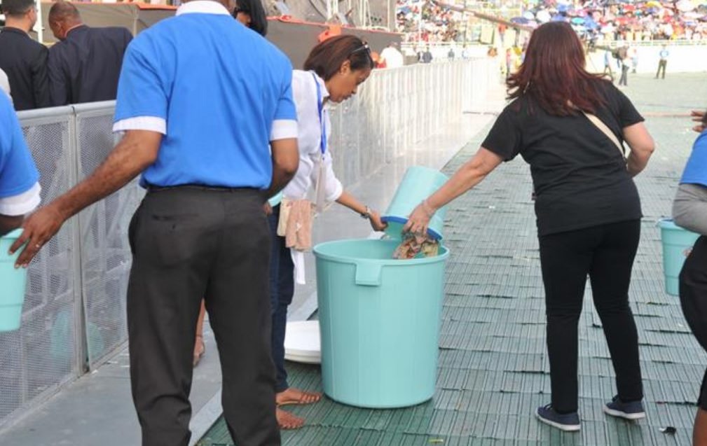 Entre los cantos y bailes de alabanzas, y las prédicas de otros pastores que estaban en la tarima; el personal del evento cargaba las cubetas azules para que los feligreses se desprendieran de las ofrendas como prueba de su fe y sacrificio espiritual.