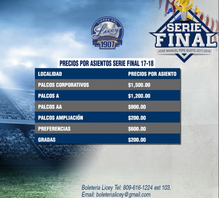 Santiago de los Caballeros. El equipo de béisbol Águilas Cibaeñas acaba de publicar los precios de las boletas para la Serie Final del torneo de béisbol Invernal 2017-2018 para cuando los partidos se jueguen en el Estadio Cibao.