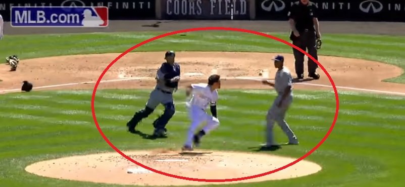 El lanzador Luis Perdomo de los Padres abrió la tercera entrada con un bola que pasó por la espalda de Nolan Arenado quien lanzó su casco al suelo y cargó con todo contra el lanzador.