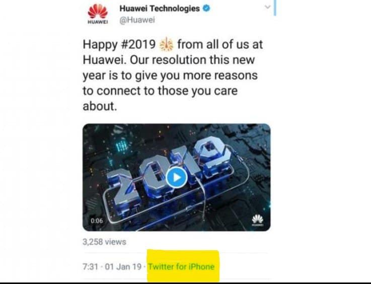 «Feliz #2019», escribieron en la cuenta de Twitter de Huawei. Pero este mensaje tenía un pequeño problema: llevaba la mención «Twitter a través de iPhone», lo que significaba que había sido escrito con el teléfono de la compañía rival.
