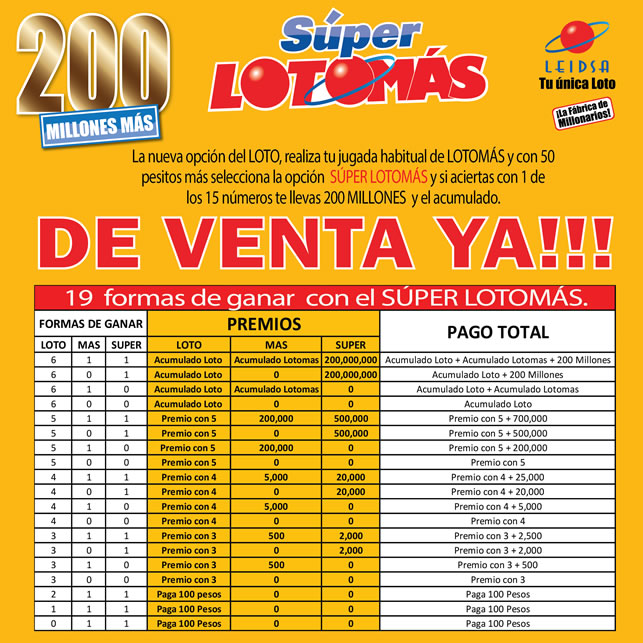 El sitio web de LEIDSA señala que el Súper Loto Más, es una jugada tradicional de LOTO-LOTOMAS, a la que se le puedes agregar 200 MILLONES fijos y otras 19 formas de ganar.