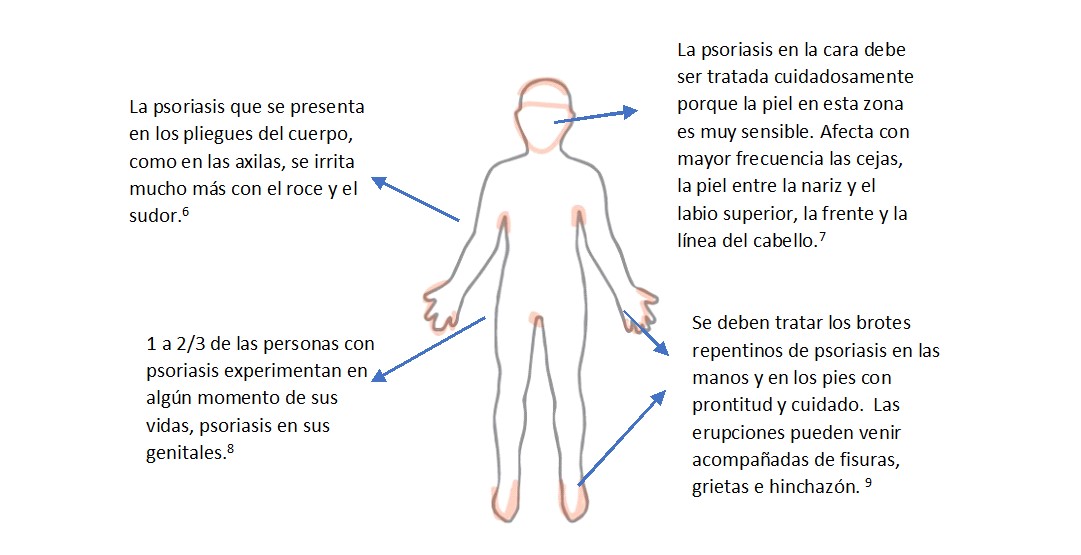 Los pacientes con psoriasis podrían tener manifestaciones clínicas que hacen difícil su diagnóstico y, en consecuencia, su adecuado manejo terapéutico. De manera menos frecuente, la psoriasis puede ocurrir en las uñas (23-27% de los pacientes con psoriasis), las palmas de las manos y las plantas de los pies (12-16%) o los pliegues (21-30%).1 La aparición de psoriasis en el cuero cabelludo es mucho más común, ocurre en el 45-56% de los casos, siendo una de las primeras áreas afectadas por la enfermedad.