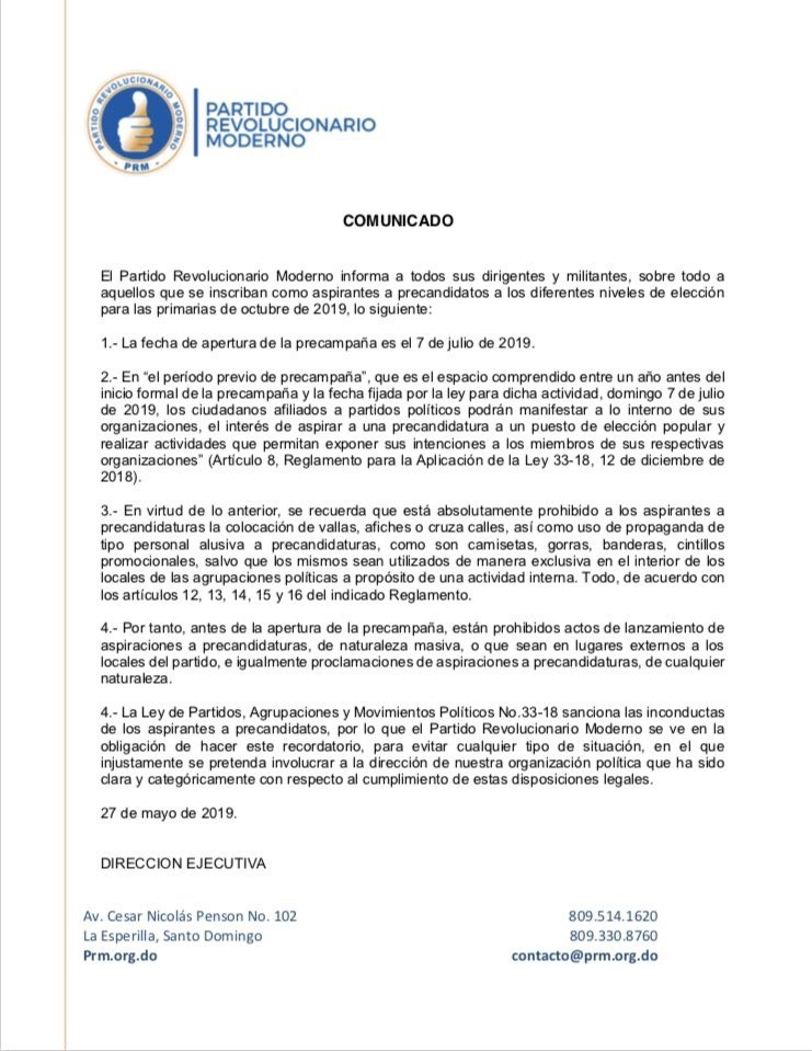 «La Ley de Partidos,Agrupaciones y Movimientos Políticos No.33-18 sanciona las inconductas de los aspirantes a pre-candidatos, por lo que el Partido Revolucionarlo Moderno se ve en la obligación de hacer este recordatorio, para evitar cualquier tipo de situación, en el que Injustamente se pretenda Involucrar a la dirección de nuestra organización política que ha sido ciara y categóricamente con respecto al cumplimiento de estas disposiciones legales», dice el comunicado del PRM.