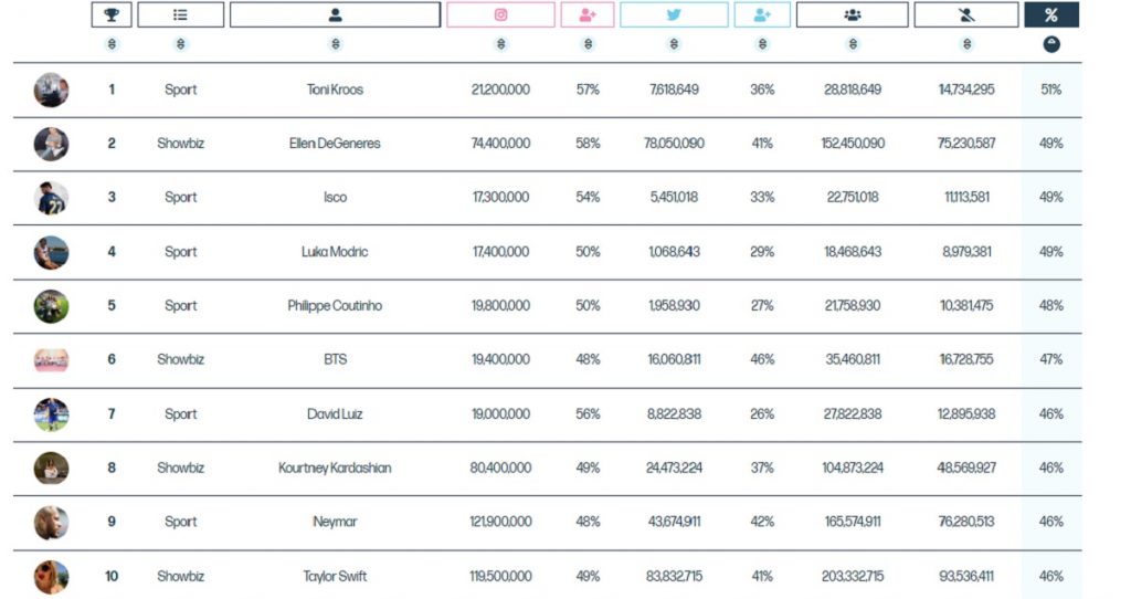 Eso sí, de antemano hay que destacar que nombres como Kourtney Kardashian, Taylor Swift y hasta Ellen DeGeneres están dentro de la lista. Pero venga, que los principales protagonistas son futbolistas de élite con vida en Europa.