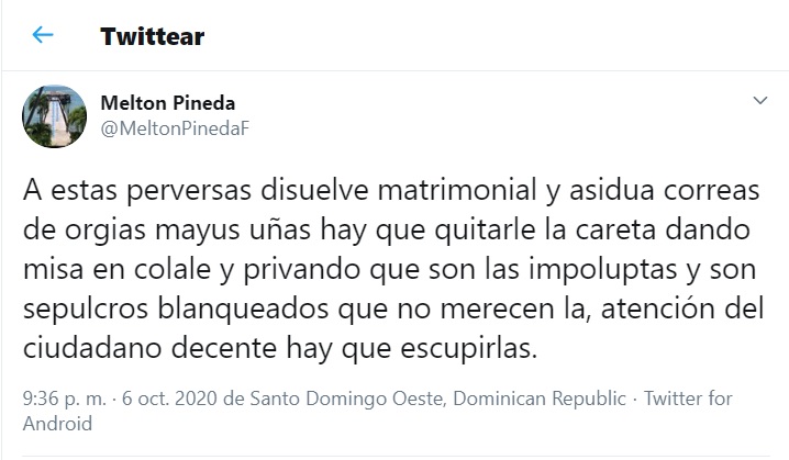 Santo Domingo. Anoche previo a que se diera a conocer que el Ministerio de Defensa, dejó sin efecto el memorándum 23771, donde se le asignaba cuatro miembros de la institución como seguridad a Melton Pineda, dos de ellos sus hijos, el periodista había lanzado una serie de ataques sin identificar a la persona que estaban dirigidos.