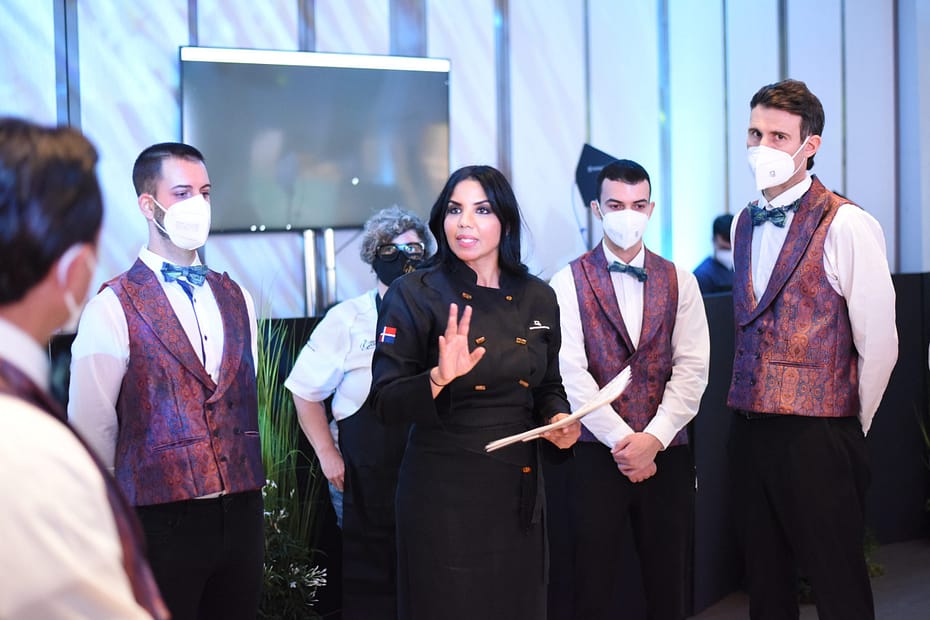 La chef presentó, a través de cinco estaciones los platos emblemáticos del país en un vistoso montaje que resaltaba los atributos de cada zona destacándose la estación de las costas de la isla; Santo Domingo colonial; la del sur profundo; del Cibao Central y la del cacao que representaba en piezas hechas de chocolate los productos de exportación nacional logrados de manera magistral y que llamó la atención de los presentes.
