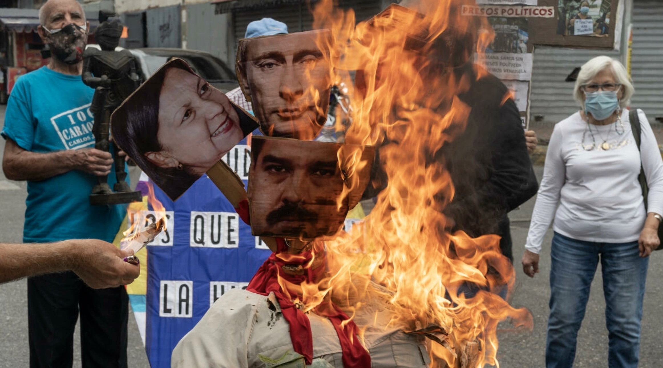 El monigote, que también tenía caras representando a la alcaldesa de Caracas, la oficialista Carmen Meléndez, y la del ministro de Energía Eléctrica, Néstor Reverol, fue incendiado por una treintena de vecinos de La Candelaria, barrio del centro de la capital venezolana, quienes portaban carteles de protesta y críticas a la gestión de las autoridades.