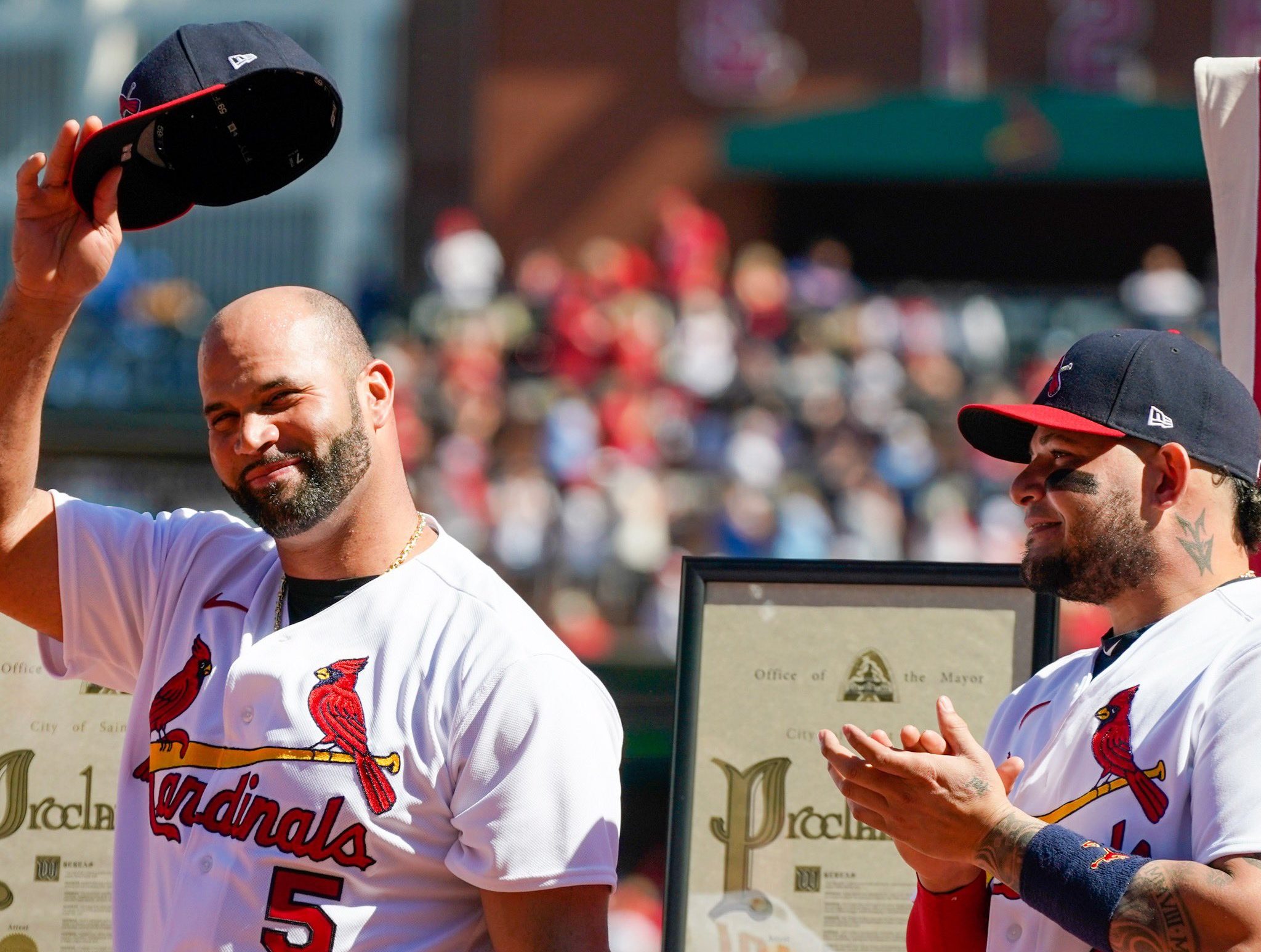 Previo al partido, Pujols y el receptor Yadier Molina, quien también se retira, fueron homenajeados en una ceremonia de 46 minutos antes de su último partido de temporada regular en casa.