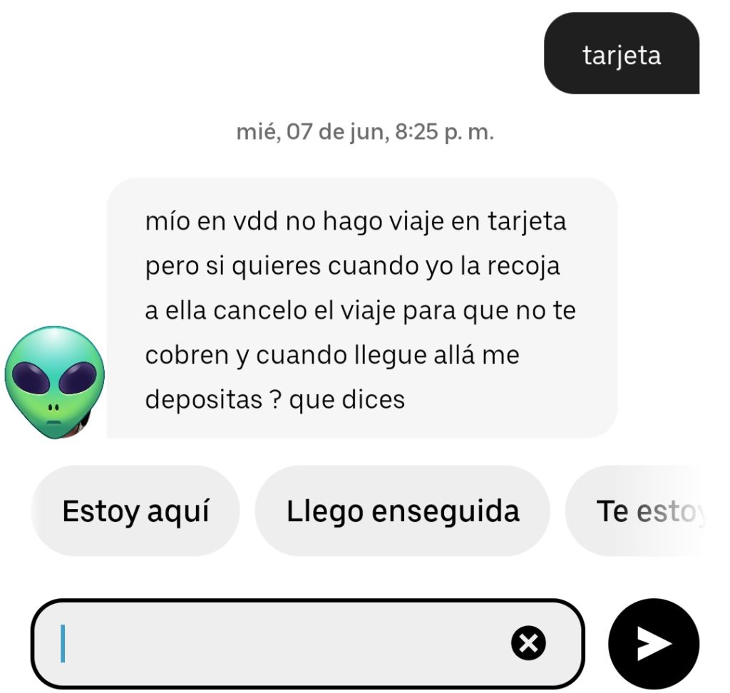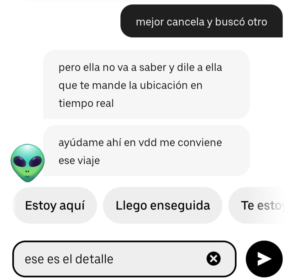 A todo esto le digo que no, que cancele pues a la persona para la cual pedí el servicio, esa jugada no le gustará, y que me encargo de pedir otro Uber.