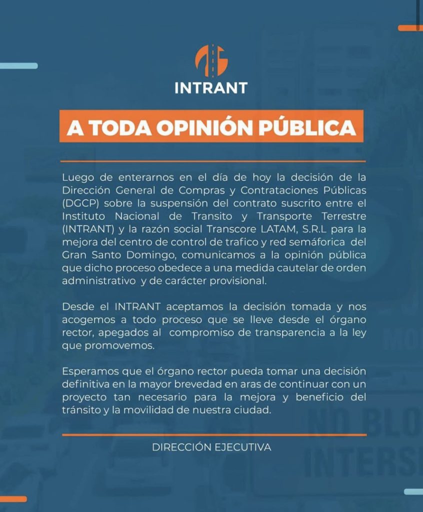 Corrió como pólvora este lunes la decisión de la Dirección General de Compras y Contrataciones Públicas (DGCP), de suspender, de manera temporal, un contrato firmado por el Instituto Nacional de Tránsito y Transporte Terrestre (INTRANT) y la empresa Transcore LATAM, S.R.L, por supuestas irregularidades halladas por el organismo fiscalizador.