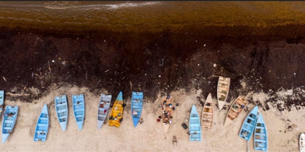 El tercer lugar de Orlando Barría, por su fotografía aérea Guayacanes y el sargazo, en que muestra botes de pescadores en una playa cubierta de sargazo. El monto del premio es de RD$64,000.00 y un certificado.