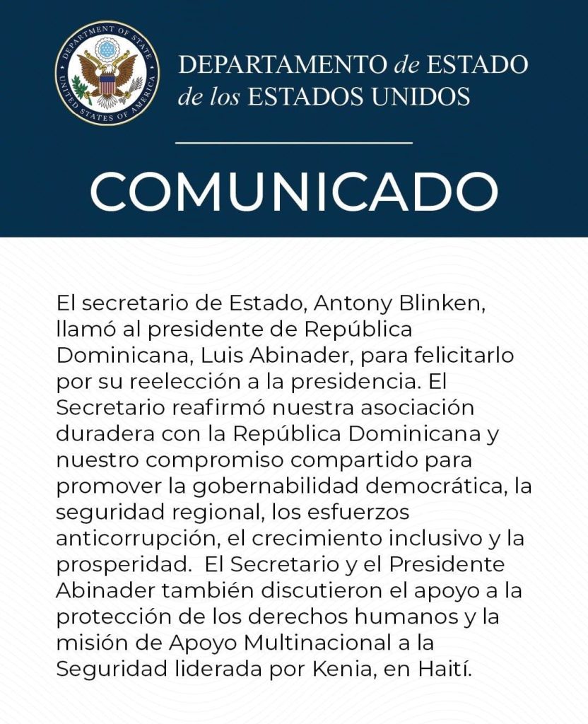 “El secretario de Estado, Anthony Blinken, llamó al presidente de la República Dominicana, Luis Abinader para felicitarlo por su reelección a la Presidencia”, indicó la institución norteamericana a través del un comunicado en su cuenta de X @EmbajadaUSAenRD.