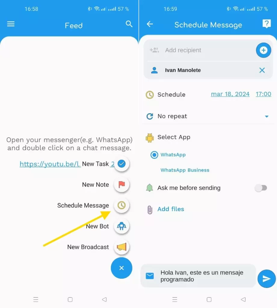 Una vez otorgados los permisos, podremos programar el mensaje en WhatsApp siguiendo estos pasos: