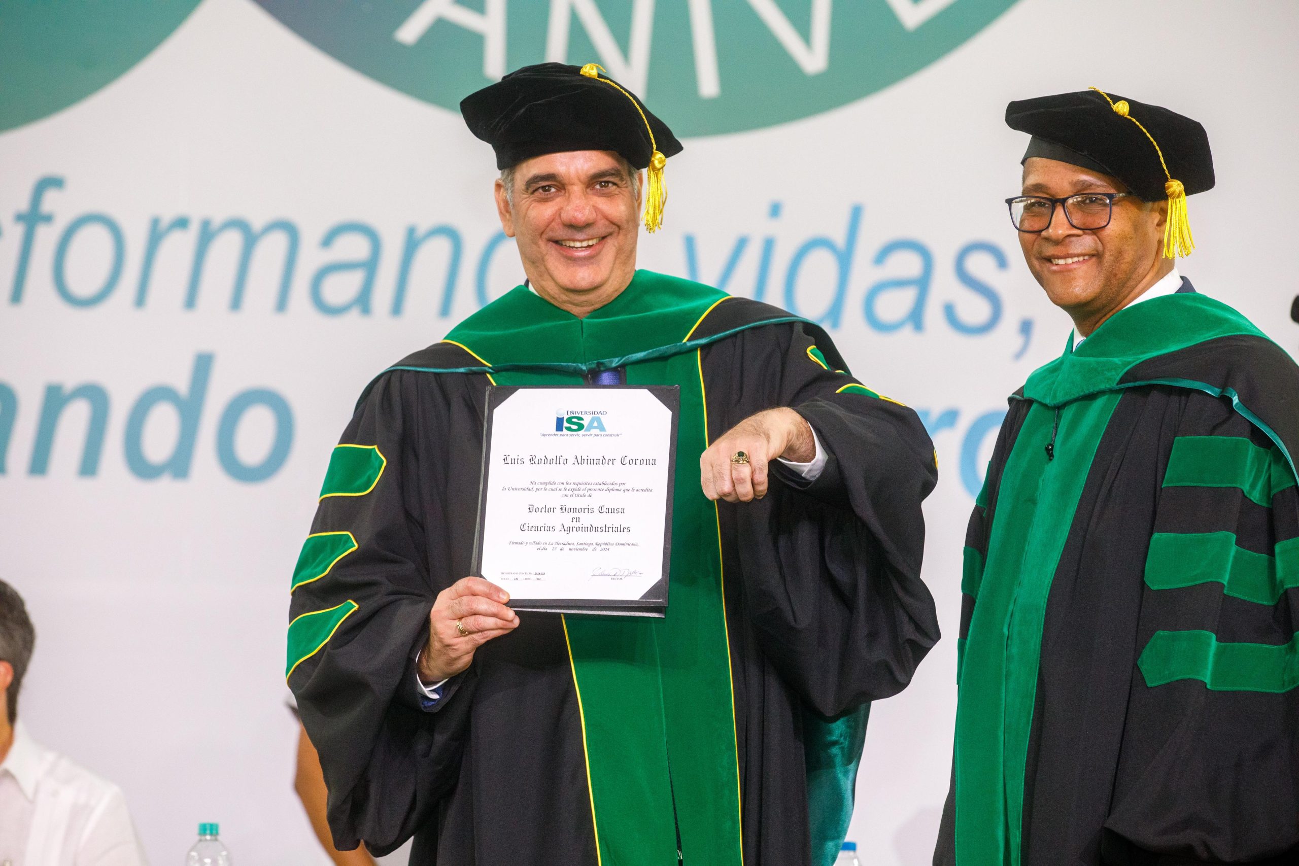 El presidente Luis Abinader fue reconocido con el título «Doctor Honoris Causa» en Ciencias Agroindustriales por la Universidad ISA, en un acto celebrado en Santiago. Este reconocimiento se otorgó en honor a sus esfuerzos por fortalecer la educación y el sector agroindustrial del país.
