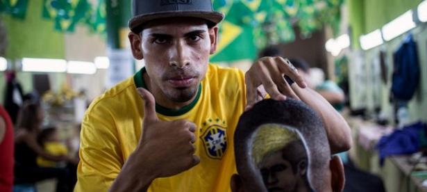 Anderson Guimaraes aguarda su turno en esta inusual barbería de paredes descascaradas decorada con ristras… Leer más »Locura mundialera llega a las peluquerías brasileñas con particulares diseños