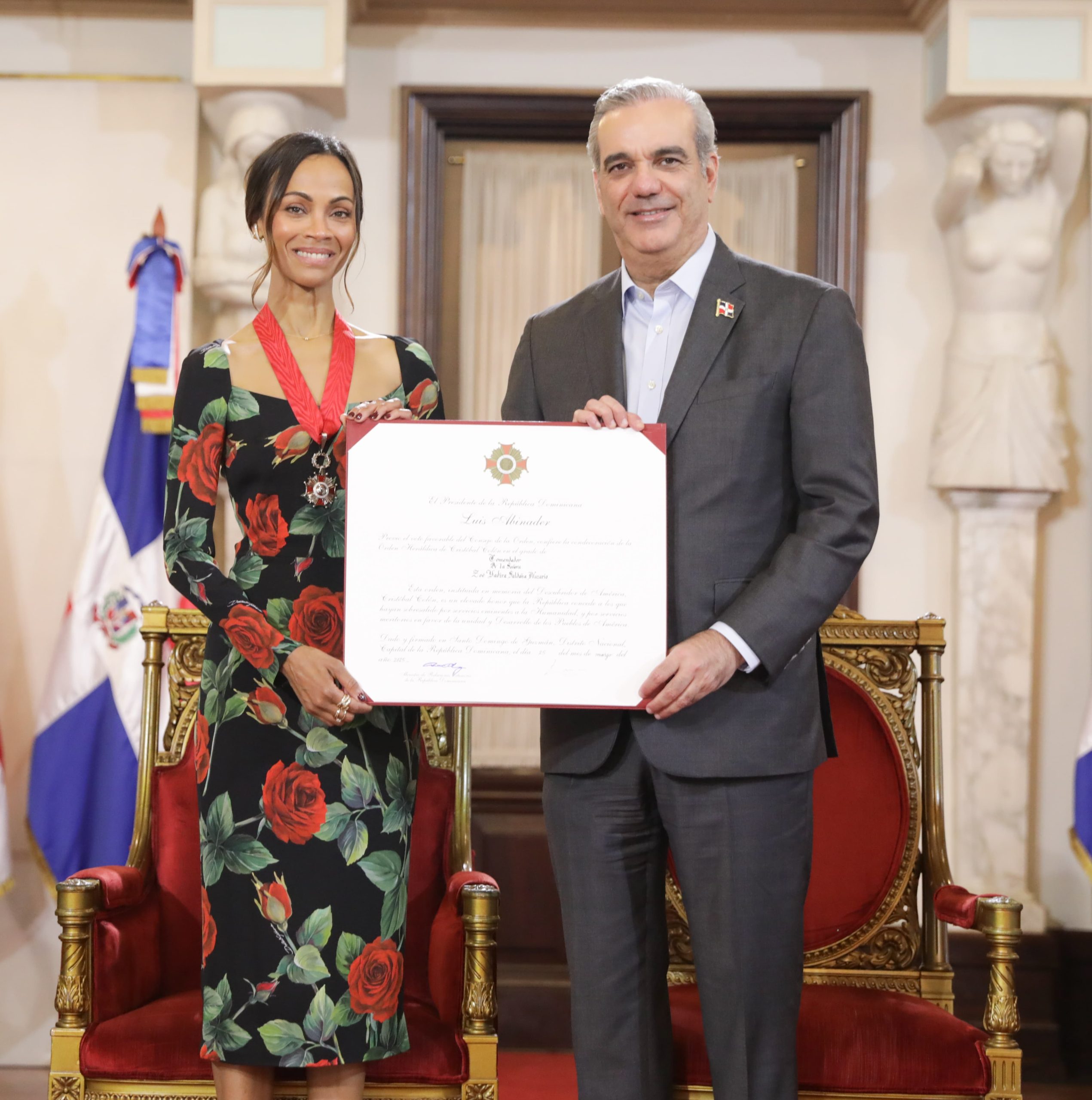 El presidente Luis Abinader junto a la vicepresidenta Raquel Peña y la primera dama Raquel… Leer más »Presidente Abinader condecora a Zoe Saldaña con la Orden Heráldica de Cristóbal Colón